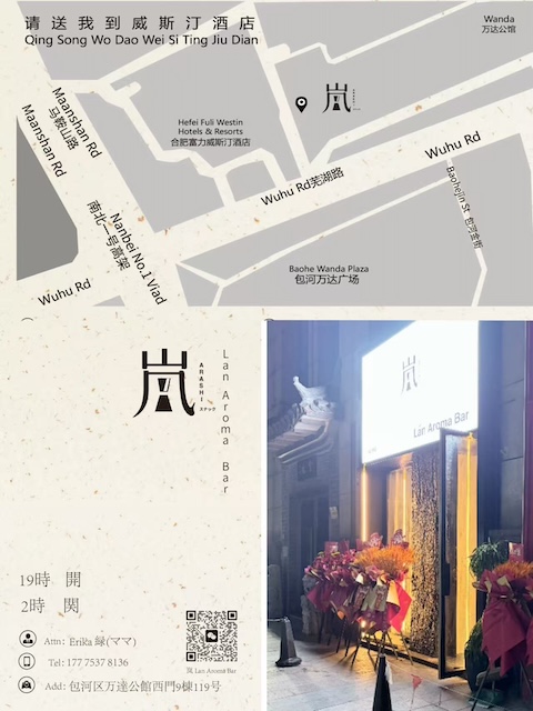 | 住所 | 合肥包河区万达公馆9栋 119 LAN 嵐スナック |